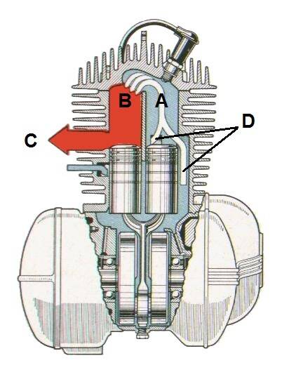Bei der Gleichstromspühlung des TRIUMPH-Doppelkolben-Motors dagegen tritt ein wesenlich geringere Vermischung der Frisch- und Altgase ein. Wohl füllen nach der Verbrennung die Restgase beide Bohrungen (A und B) des Zylinders vollständig aus; sobald aber der Kolben in der Bohrung B die Auslaßschlitze C freigebt, strömen die gespannten Restgase durch diese Öffnung ab, so daß durch die einen Augenblick später sich öffenden Überstromschlitze D die Frischgase aus dem Kurbelgehäuse in die Zylinderbohrung A eindringen können. Die Frischgase folgen also den abströmenden Restgase nach. Die hierbij erzielte Trennung der beide Gase ergibt nur geringse Frischgas-Verluste, dadurch beste Füllung der Zylinder bohrungen und somit einde hohe Leistungsausbeute bei sparsamstem Brennstoffverbrauch.
